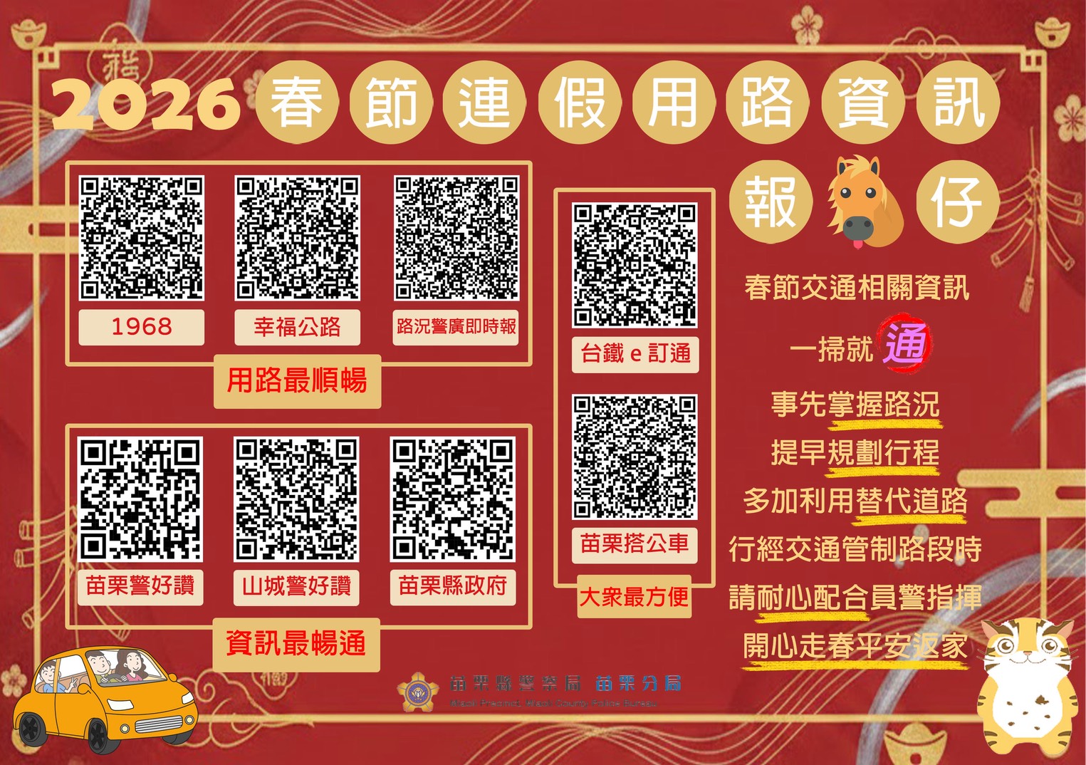 苗栗警察分局表示,本次創新作法透過QR Code整合多項交通與公共服務資訊,包括「高速公路1968」、「幸福公路」即時路況平台,以及「苗栗搭公車」、「台鐵e訂通」、「停車大聲公」等交通服務APP,同時彙整苗栗縣政府及警察局公告之交通管制措施、替代道路建議及春節用路資訊,讓民眾只需掃碼即可快速取得完整資訊。
