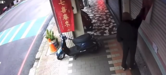 黑衣阿北持刀割春聯。翻攝畫面