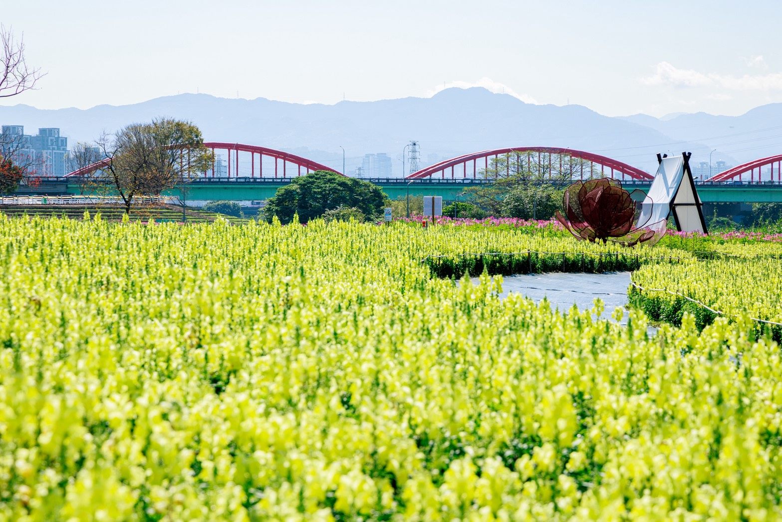 值得一提的是,今年首度引進「粉蝶花」與「麝香木」兩大夢幻花卉,民眾無須遠赴日本茨城縣,在台北便能邂逅那抹令人心醉的「嬰兒藍」粉蝶花海;而如粉色雲霧般的麝香木,更讓古亭河濱的每一個轉角,都瀰漫著濃郁唯美的早春浪漫。此外,水利處更如畫家般,巧妙揉入橘黃色系草花與金魚草,透過鮮明的「撞色」美學,為整片花毯注入溫暖與活力。