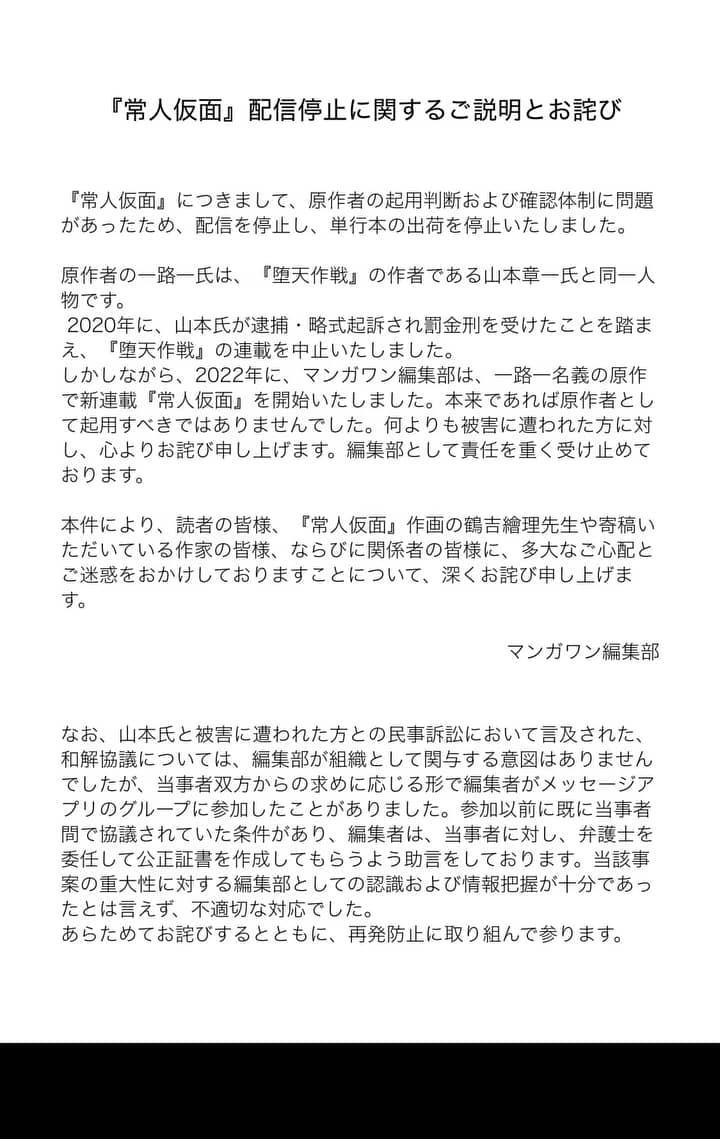 小學館在官方聲明中提到,《常人仮面》原作者「一路一」與《堕天作戦》的山本章一為同一人。山本章一於2020年被逮捕,並在起訴後遭判罰金刑,因此《堕天作戦》連載中止。然而,編輯部仍於2022年以「一路一」名義展開新連載《常人仮面》。聲明承認不應起用其為原作者,並表示「對於首先受到傷害的人士,致上由衷歉意」。