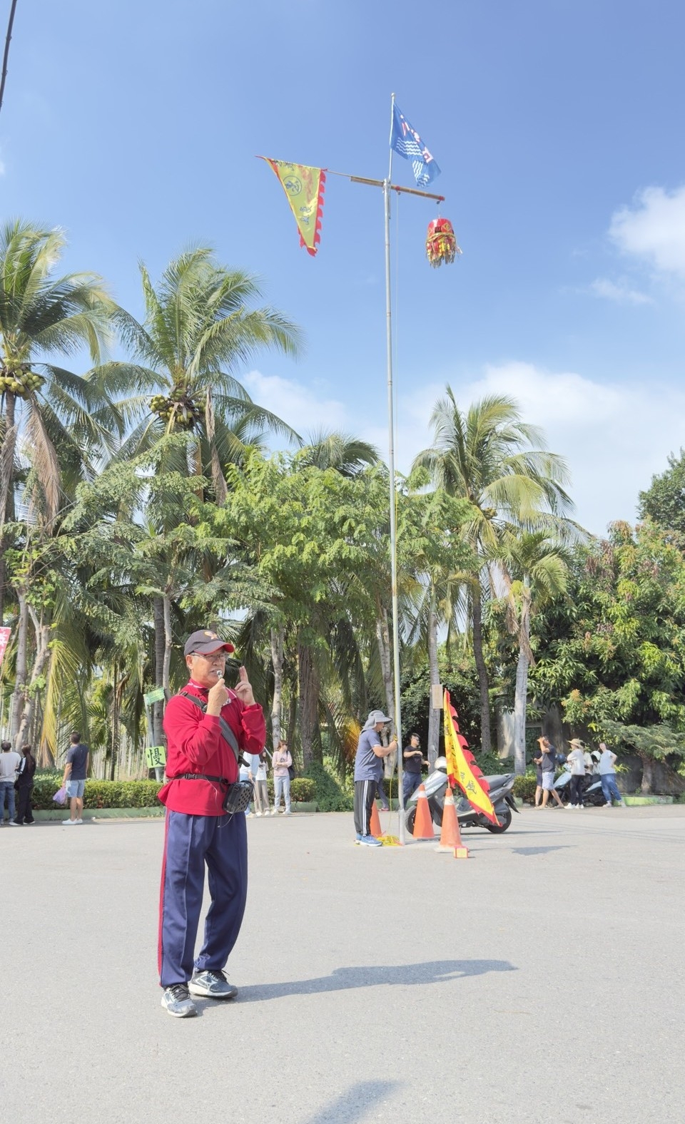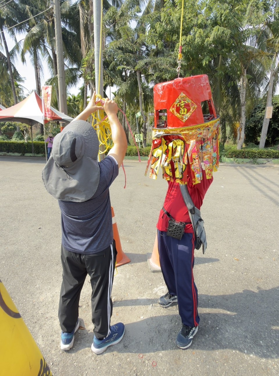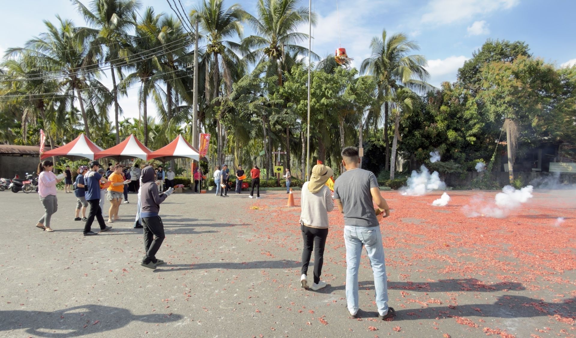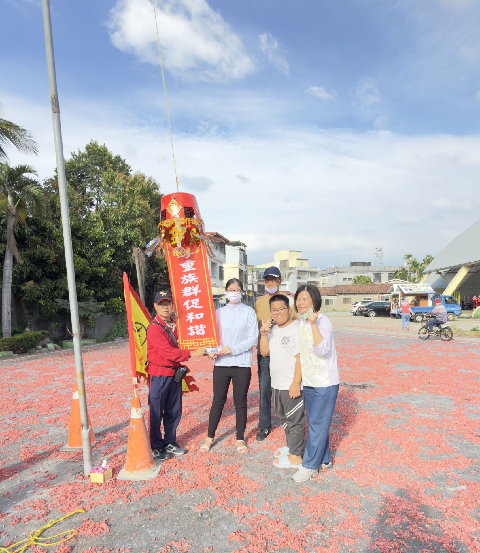 活動開場由身穿醒目紅衣的在地藝術家、木石居「昌黎硯」達人林富章擔任主持,生動幽默的解說瞬間炒熱現場氣氛。隨著屏東縣議員李世淦親自主持開炮儀式,引爆了這場結合挑戰與人文饗宴的序曲。從現場畫面可見,高聳入雲的竹竿上懸掛著特製的大紅炮籠,挑戰者們無不屏氣凝神,手持點燃的排炮,以精準的眼力與臂力向上投擲。當鞭炮精準竄入炮籠引發連環爆炸、白煙竄升之際,炮籠底部的紅布條「重族群促和諧」華麗垂降,現場瞬間爆出如雷的喝采聲!泗溝村村長林國傑也親臨現場,開心頒發「挑戰成功」的祈福紅包給神準中靶的鄉親,場面溫馨且熱烈。