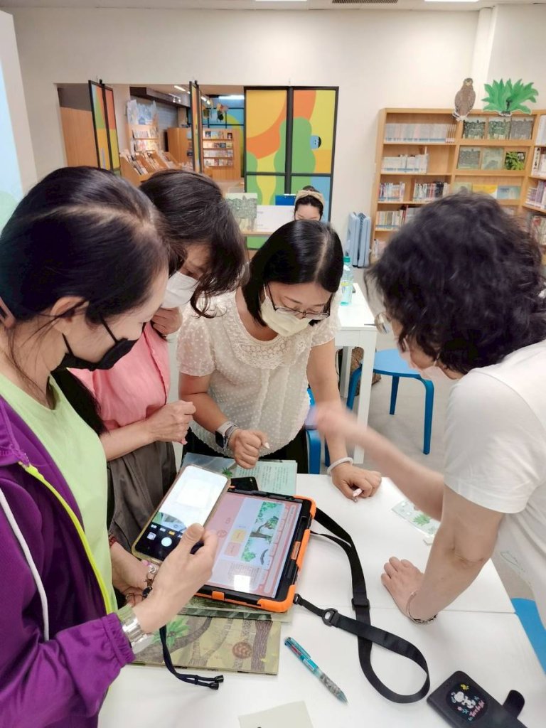 故事組的靈魂人物——組長葉鴻秋,是開館以來的元老志工。她笑說:「這個螢幕就像一本會動的大書,說故事變成一場冒險,越說越開心。」
