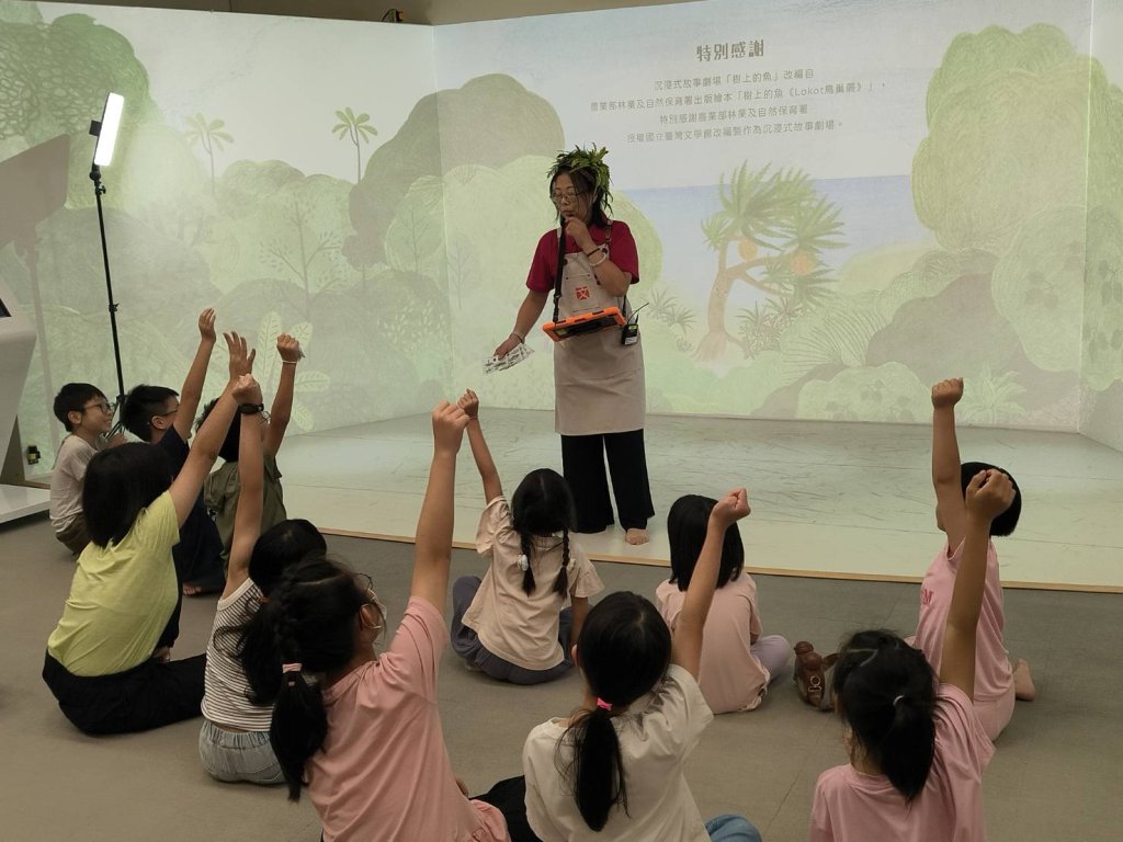 今年五月,團隊將原先《樹上的魚(Lokot鳥巢蕨)》繪本沉浸式故事劇場變得更加活潑生動了。不再只是朗讀,而是搭配大螢幕、聲光與動畫,讓孩子們彷彿走進故事場景中,一邊看一邊聽,眼睛和心都亮了起來。