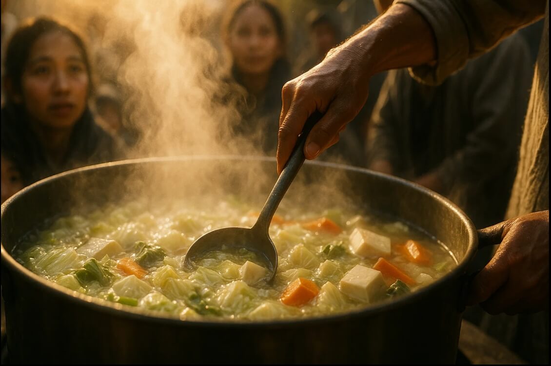 你能想像嗎?在滿是泥濘與寒意的夜晚,當第一鍋熱湯被端出來,整個避難所突然安靜了下來。孩子的哭聲停了,長者的手不再顫抖,大家只是望著那股帶著薑香與蔬菜氣息的熱氣。那不是普通的一鍋湯,而是一種「活下去的力量」。