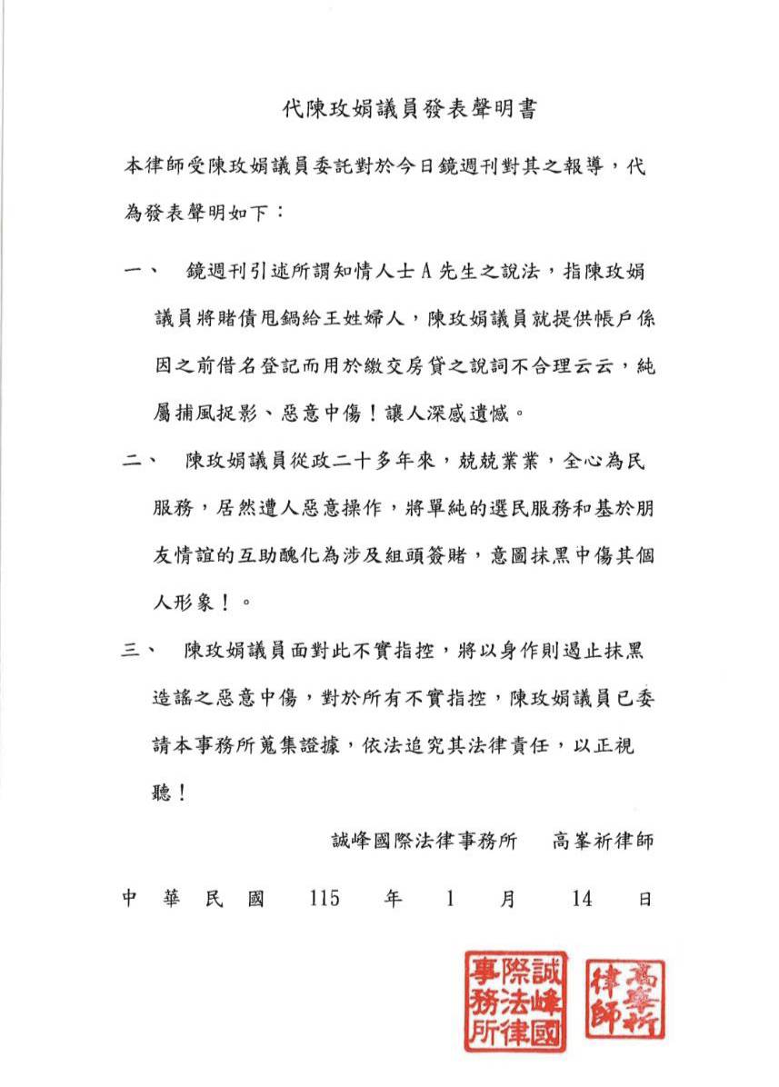 聲明指出,《鏡遇刊》引述所謂「知情人士A先生」之說法,指稱陳玫娟議員將賭債「甩鍋」給王姓婦人,並質疑議員提供帳戶係因先前借名登記、用於繳交房貸之說法不合理等內容,均未提出任何具體事證,純屬片面揣測與惡意臆測,與事實嚴重不符,令人深感遺憾。