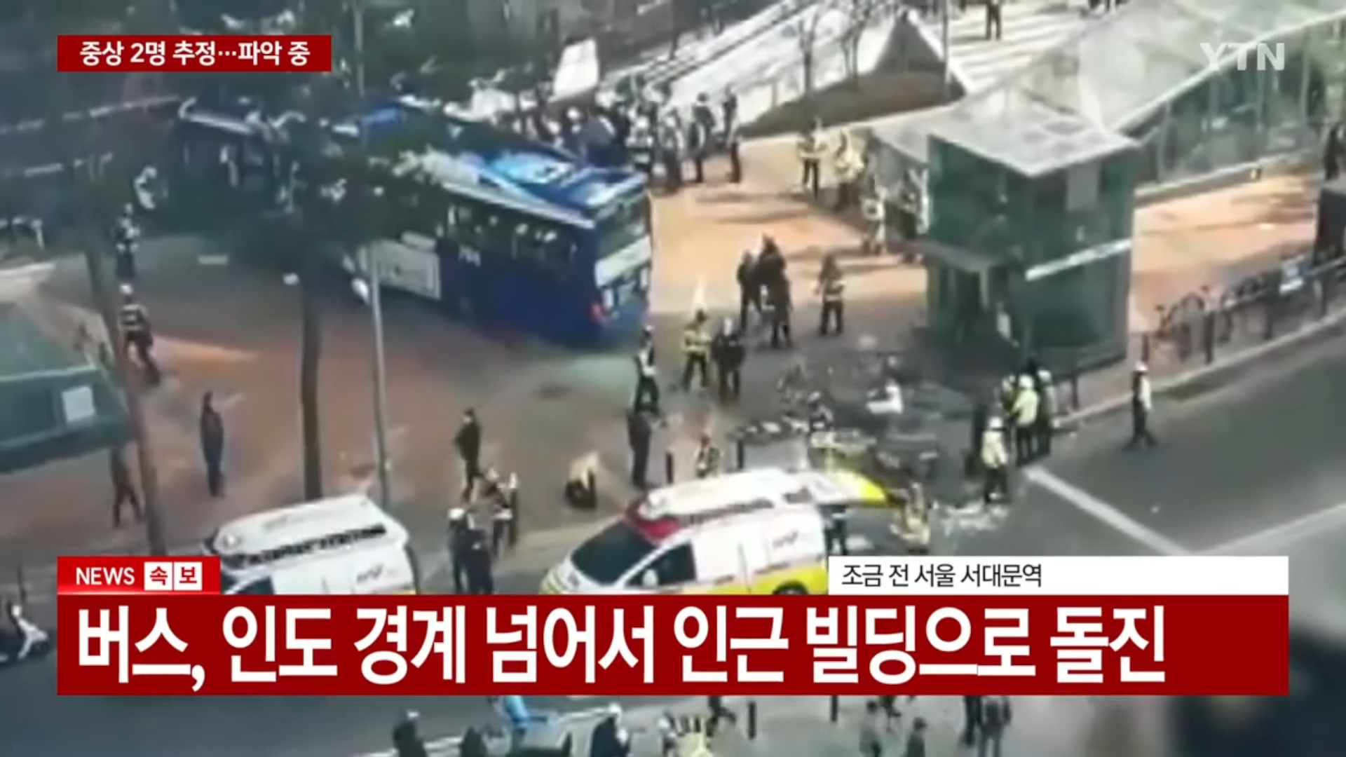 綜合韓媒報導,事故發生在當地時間下午約 1時27分許,地點在西大門站十字路口一帶。公車不明原因偏離車道,直接跨越人行道邊界衝撞上去,現場可見車輛前方受損、擋風玻璃破裂,地面也散落零件殘骸,消防與救援人員趕抵後立即分送傷者、協助送醫。