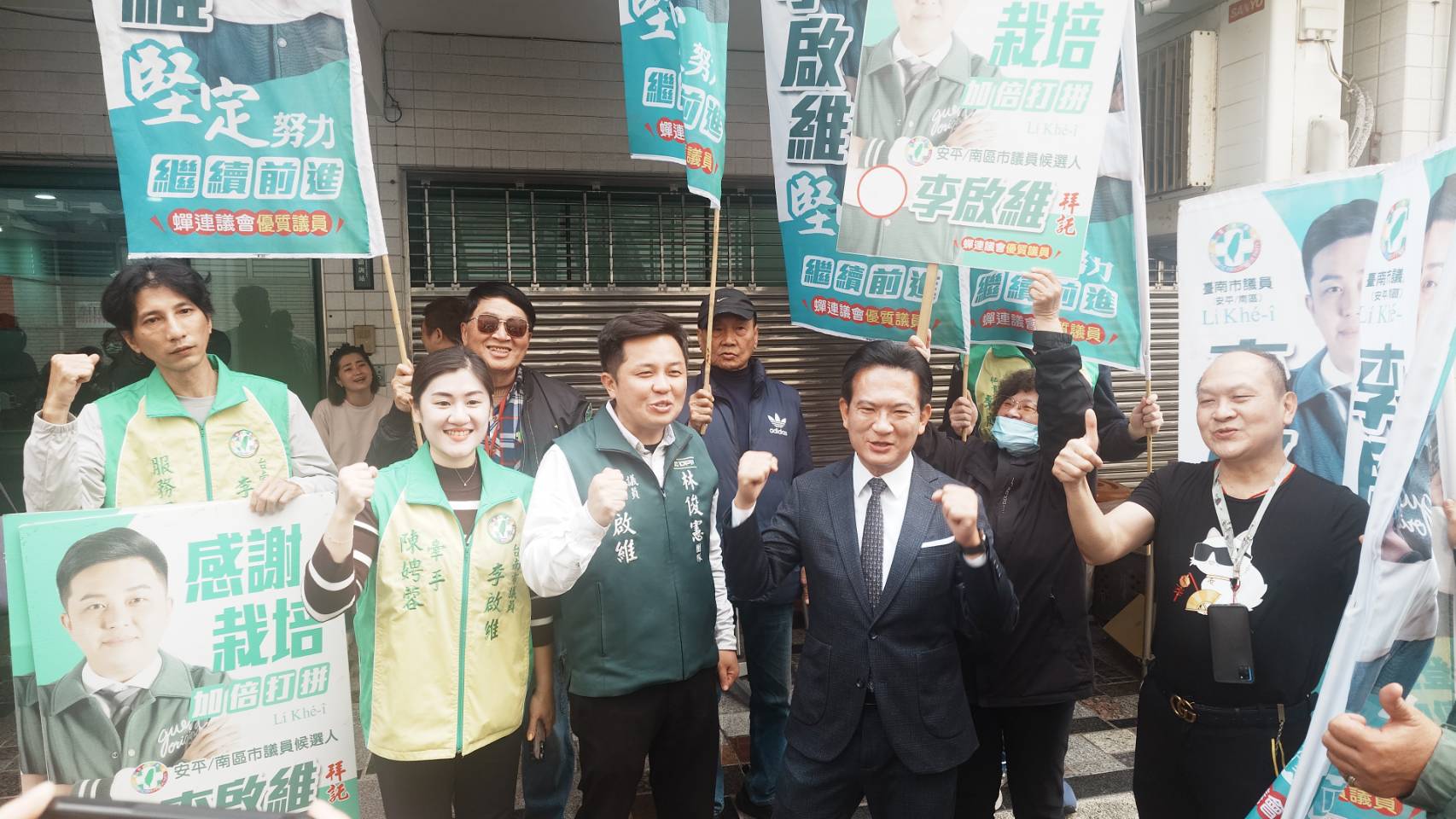 南區、安平區現任議員李啟維也於今日完成登記,尋求連任。身為第四屆議員,李啟維強調自己傳承其父李文正前議員「一人當選、兩人服務」的熱誠,過去兩屆任期深入基層。他表示,未來將繼續針對母語教育、海洋城市觀光(如運河、鯤喜灣)及解決淹水、交通等民生問題全力以赴,守護本土認同。