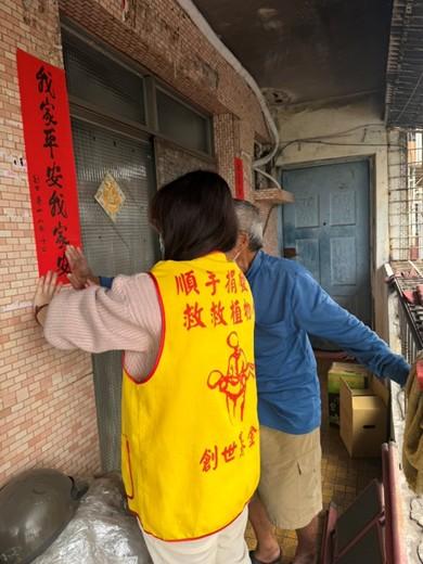 【視傳媒記者吉雄世高雄報導】創世、華山、人安策略聯盟關懷殘、老、窮,辦理第36屆「寒士吃飽30」送禮到家活動,於2月2日開始,動員約2,000位同仁及義工,同步送禮到台澎金馬22個縣市,共1萬4千多位服務對象手中。創世鳳山分院團隊集結善心馬力全開,將年禮及紅包親送到鳥松區到宅服務個案黃家,協助貼上吉祥喜氣的春聯,提前祝賀新年快樂,在合影留念時,黃先生靦腆又輕聲地說「可以幫我們拍一張全家福嗎?」