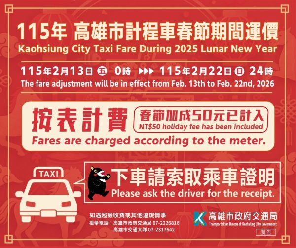 【視傳媒記者吉雄世高雄報導】農曆春節即將到來,高雄市政府交通局表示, 115年高雄市計程車春節加成自2月13日至2月22日共10天,除原日、夜間運價(夜間23時至凌晨6時加2成)計費外,每趟次再加收50元,由於計費表已納有春節加成功能,請民眾依跳表金額支付車資。