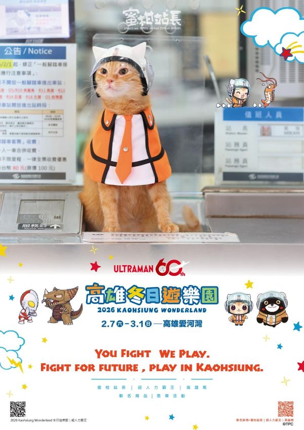 為迎接2026冬季旅遊熱潮與春節連假,高雄市今年冬日遊樂園以「超人力霸王」為主題 IP,將於愛河灣及高雄港16-18號碼頭盛大登場,Q版超人力霸王與怪獸FRP也出現在捷運美麗島站讓民眾捕捉拍照,而可愛的「蜜柑站長」與高雄熊則於本周壓軸登場,穿上超人力霸王科學特殊搜查隊造型與大家見面,想要見到萌萌蜜柑換裝秀的粉絲可於大年初二前往橋頭糖廠站觀看蜜柑值勤。期間限定的彩繪輕軌列車「虎遊岡山號」行駛至2月23日,「冬日遊樂園」號行駛至3月1日,「萌虎平安號」行駛至4月30日止,歡迎民眾上高雄捷運APP或官網查詢列車動態,在搭乘輕軌暢遊高雄的同時,也能近距離感受各式文化交流的可愛魅力。