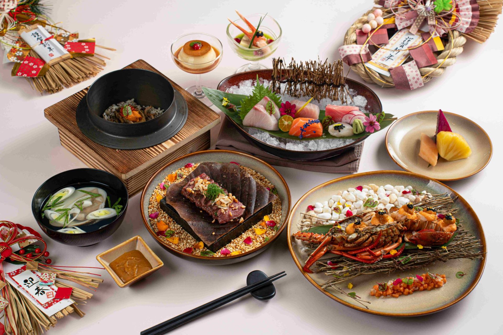 喜愛精緻日式料理的饕客,亦可選擇煉‧瓦日式料理推出的「日料新春套餐」與「鐵板燒新年套餐」,從松葉蟹、澳洲龍蝦、日本黑鮪魚到日本 A5 和牛,透過職人手藝呈現節慶餐桌的層次與儀式感,適合親友聚餐或節日聚會。