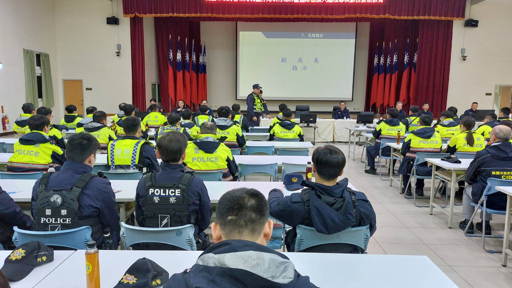 【 視傳媒記者袁慧心/桃園報導】 桃園市政府警察局桃園分局為落實「115年加強重要節日安全維護工作」,於115年2月9日21時,假桃園分局大禮堂舉行「桃園市115年加強重要節日安全維護工作首日警力展示暨執行雷霆除暴專案」,由警察局副局長鄭榮崑主持勤前教育,宣示本項工作期間,警方打擊犯罪、維護治安之決心,現場陣容壯盛、士氣高昂,在指揮官一聲令下,所有警車開啟警示燈,出發開始執行雷霆掃蕩勤務。