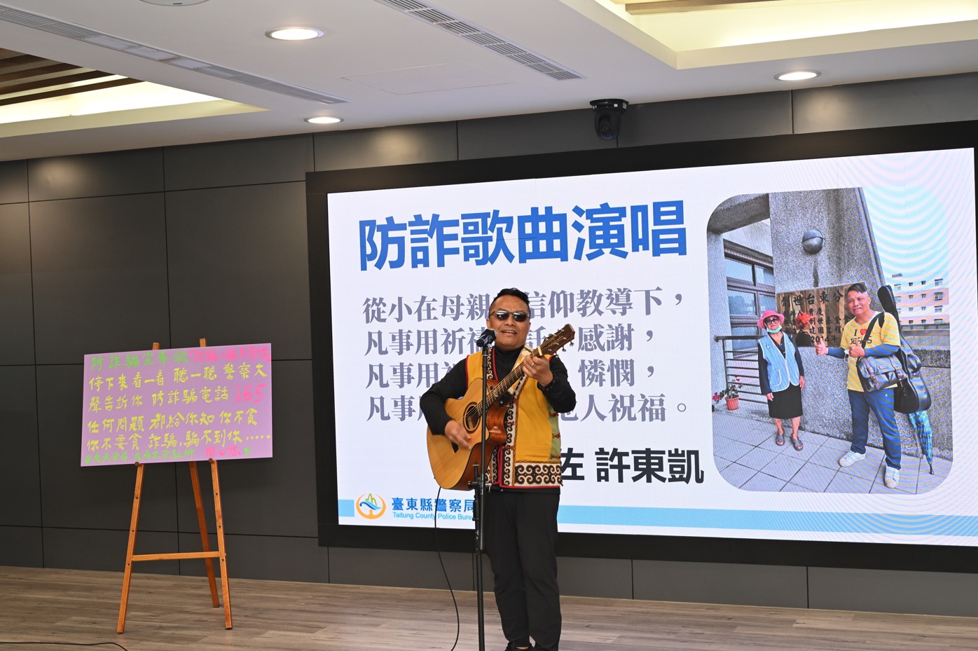 台東大分局巡佐許東凱彈唱自創反詐歌曲。翻攝畫面