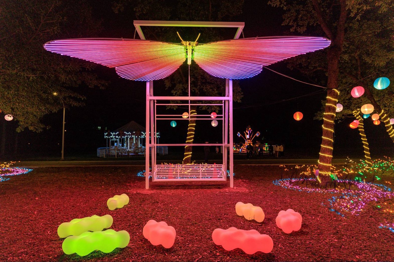 進入虎頭山創新園區「未來光域」,高 13 公尺、展翼 18 公尺的全金屬機械主燈「飛馬耀桃園」威震全場,結合煙霧、雷射與多軸機械運作,展現翱翔天際的氣勢。園區宛如魔幻的未來花園,設有超大蝴蝶翅膀互動鞦韆,更隱藏著科技驚喜:民眾掃描現場 QR Code,即可透過 AR 技術看見空中虛擬裝置,進行「現地美拍」或線上「求籤祈福」。此外,園區內規劃旋轉木馬、海盜船、摩托車、小火車等設施供小朋友免費搭乘,讓賞燈之餘充滿歡笑聲。