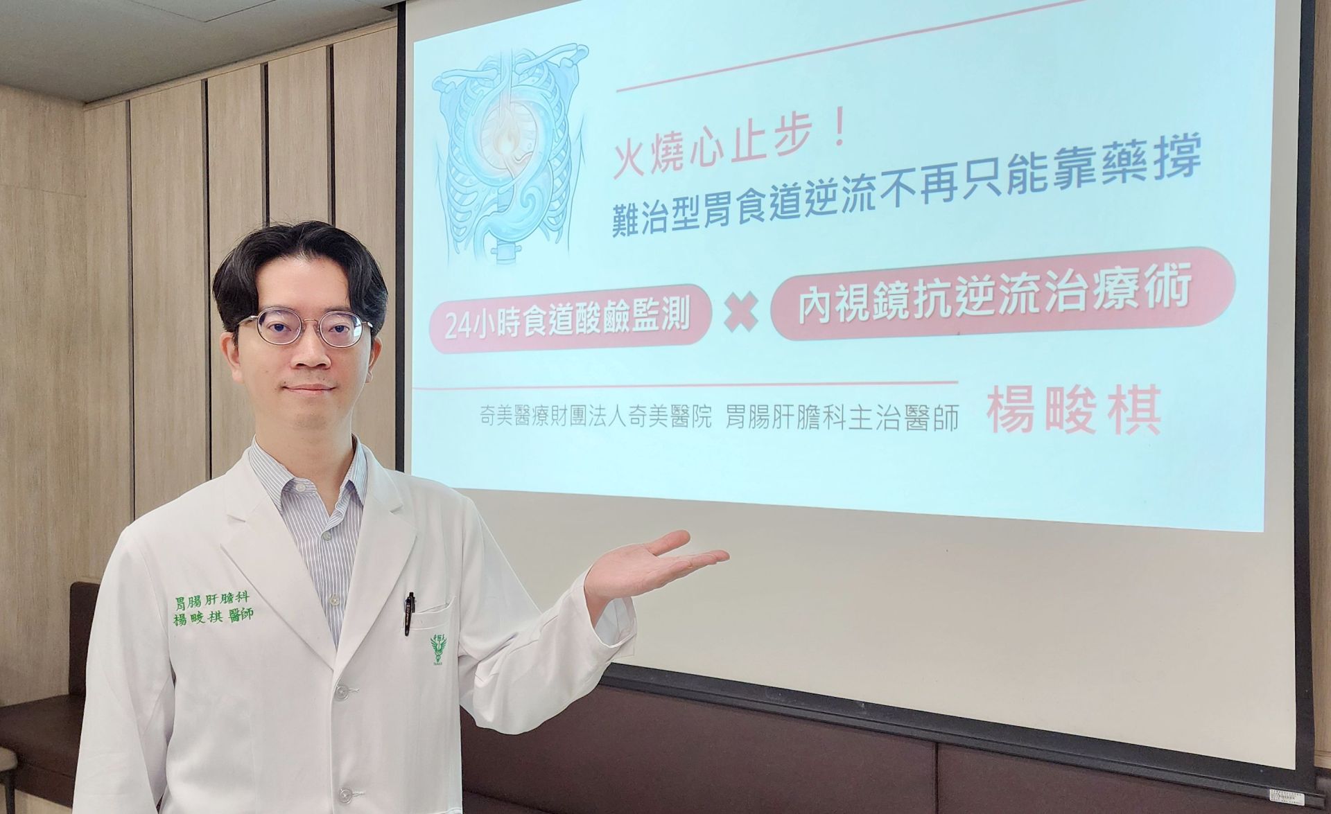 針對藥物控制不佳的病人,奇美醫院引進「內視鏡抗逆流治療術」,提供新的治療選項。奇美醫療財團法人奇美醫院胃腸肝膽科主治醫師楊畯棋說明,此技術不需傳統開刀,而是透過內視鏡進行黏膜燒灼,利用組織癒合時產生的自然收縮力量,使原本鬆弛的賁門(胃與食道的接口)重新縮緊,從源頭改善胃酸逆流問題。根據文獻系統性回顧指出,此類治療整體臨床成功率約74%,且一年內約44%的病人可減少或停用質子幫浦抑制劑(PPI)藥物,不僅降低長期用藥可能帶來的副作用,也減輕病人的心理負擔。