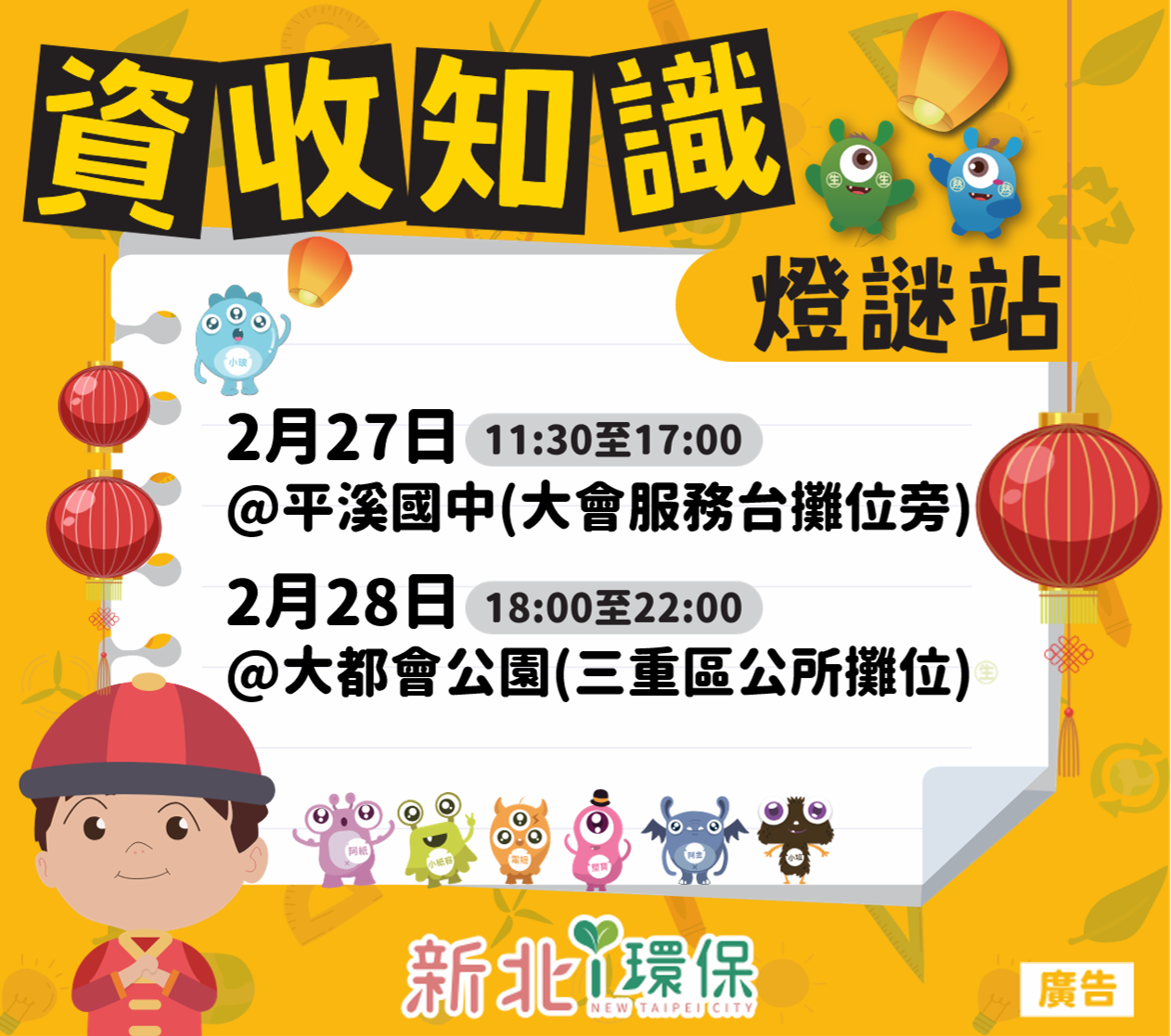 環保局指出,元宵提燈內使用後的電池,以及家中廢棄的行動電源,含有害重金屬,若未依規定回收處理,恐造成環境污染,故第二場活動於2月28日18時至22時在大都會公園辦理,民眾只要攜帶20顆廢乾電池或1個廢棄行動電源至2026新北燈會「資收知識燈謎站」活動攤位(三重區公所攤位),即可兌換「新北i環保」清潔吸水巾,每人限領1份,換完為止,現場也加碼互動遊戲,民眾加入「新北市回收物品易查通」LINE官方帳號,即可再獲得精美小禮。