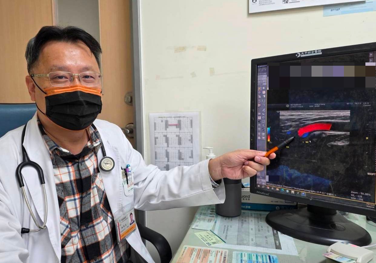 透過頸動脈超音波發現,病人左側內頸動脈已完全阻塞(黃圈處)。照片:大千綜合醫院提供