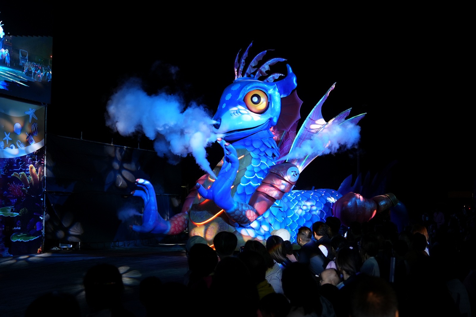 客家親子劇《燈怪》26日晚間起一連3天在屏東市和生市地重劃區盛大登場,首場即吸引近4,000名觀眾湧入,現場宛如大型戶外嘉年華。當高達8公尺、身長11公尺的巨型機械獸「燈燈國王」震撼現身,緩步穿梭人群、眨眼噴氣與觀眾互動時,大小朋友揮舞螢光棒、驚呼連連,氣氛瞬間沸騰。屏東縣長周春米也到場與民眾一同觀賞,直呼演出精彩動人,邀請鄉親把握連假前來共賞。