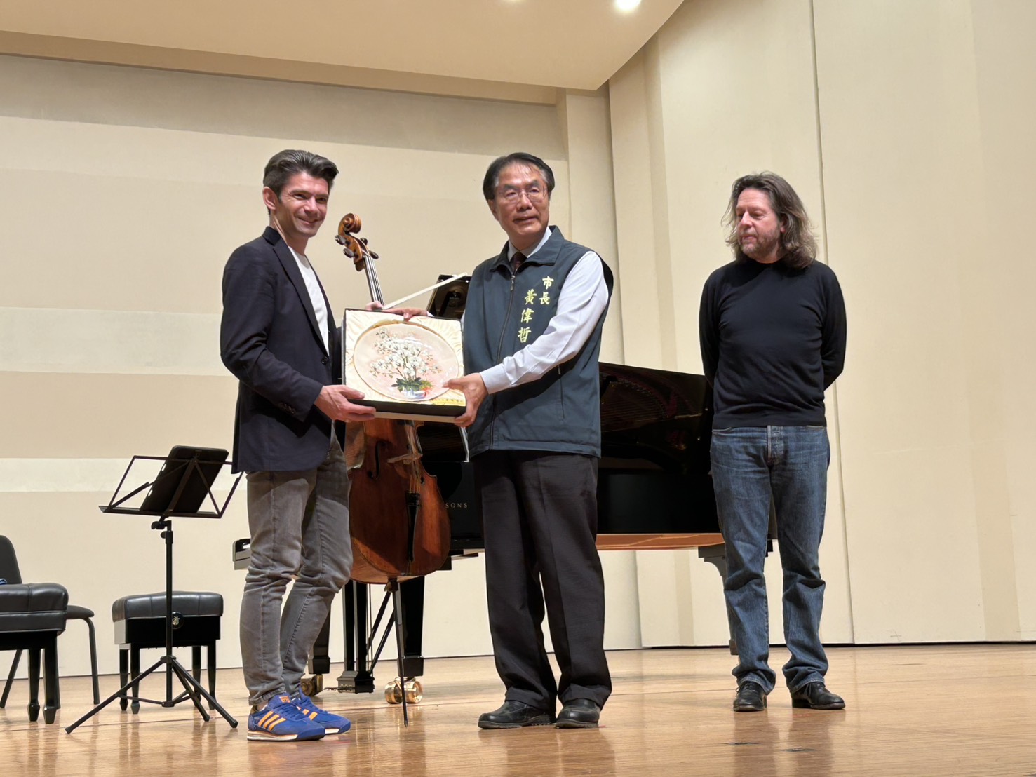 ▲市長黃偉哲致贈蘭花盤予大提琴家高提耶・卡普松,象徵台南城市文化禮讚與誠摯感謝。(記者黃雋淮 攝)