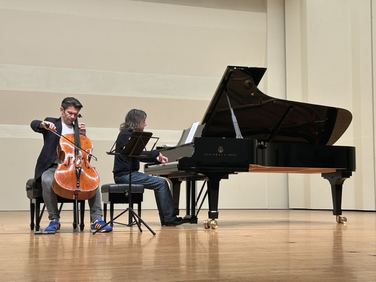 ▲2026台南國際音樂節開幕演出由國際大提琴巨星高提耶・卡普松與鋼琴家法蘭克.布雷利攜手演出,琴音於台南文化中心悠揚迴盪,為音樂節揭開動人序章。(記者黃雋淮 攝)