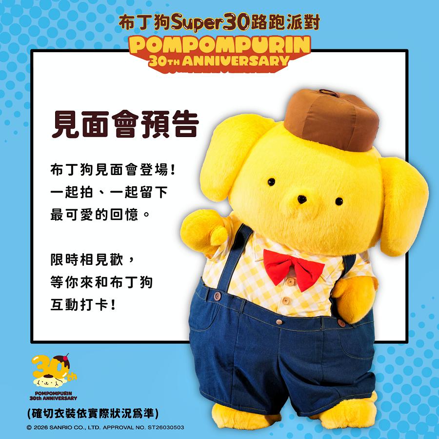 2025年三麗鷗人氣大賞全球第一、台灣第一的超人氣角色布丁狗(Pompompurin),今(2026)年正式迎來出道30週年。為慶祝這個重要里程碑,特別推出「布丁狗 SUPER30 路跑派對」,7月12日於新北大都會公園(3.5K)、7月26日於高雄時代大道接力登場。有別於一般競技型賽事,此活動以歡樂派對為定位,強調「跑出快樂能量」,適合各年齡層與不同運動程度的參加者,致力於以30週年限定「超級英雄布丁狗」為主題,打造一場結合路跑、周邊收藏與慶生體驗的年度盛事。
