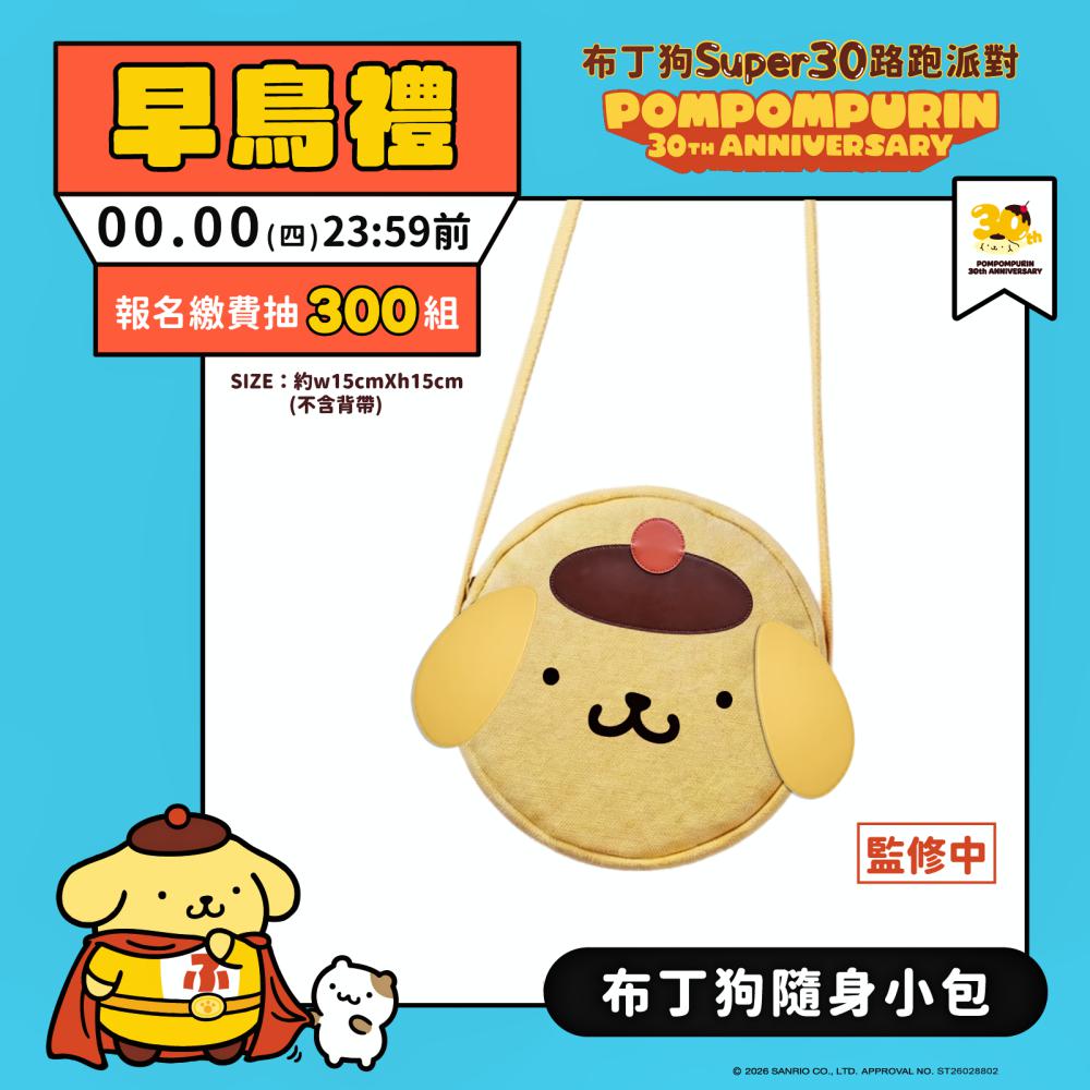 ▲慶祝三麗鷗全球人氣冠軍布丁狗出道30週年重要里程碑,特別推出「布丁狗 SUPER30 路跑派對」,指定期限前完成報名繳費者,即可免費獲得布丁狗隨身小包抽獎資格。團體報名每位成員皆享抽獎機會,各場限量300組。(圖/全統運動提供)