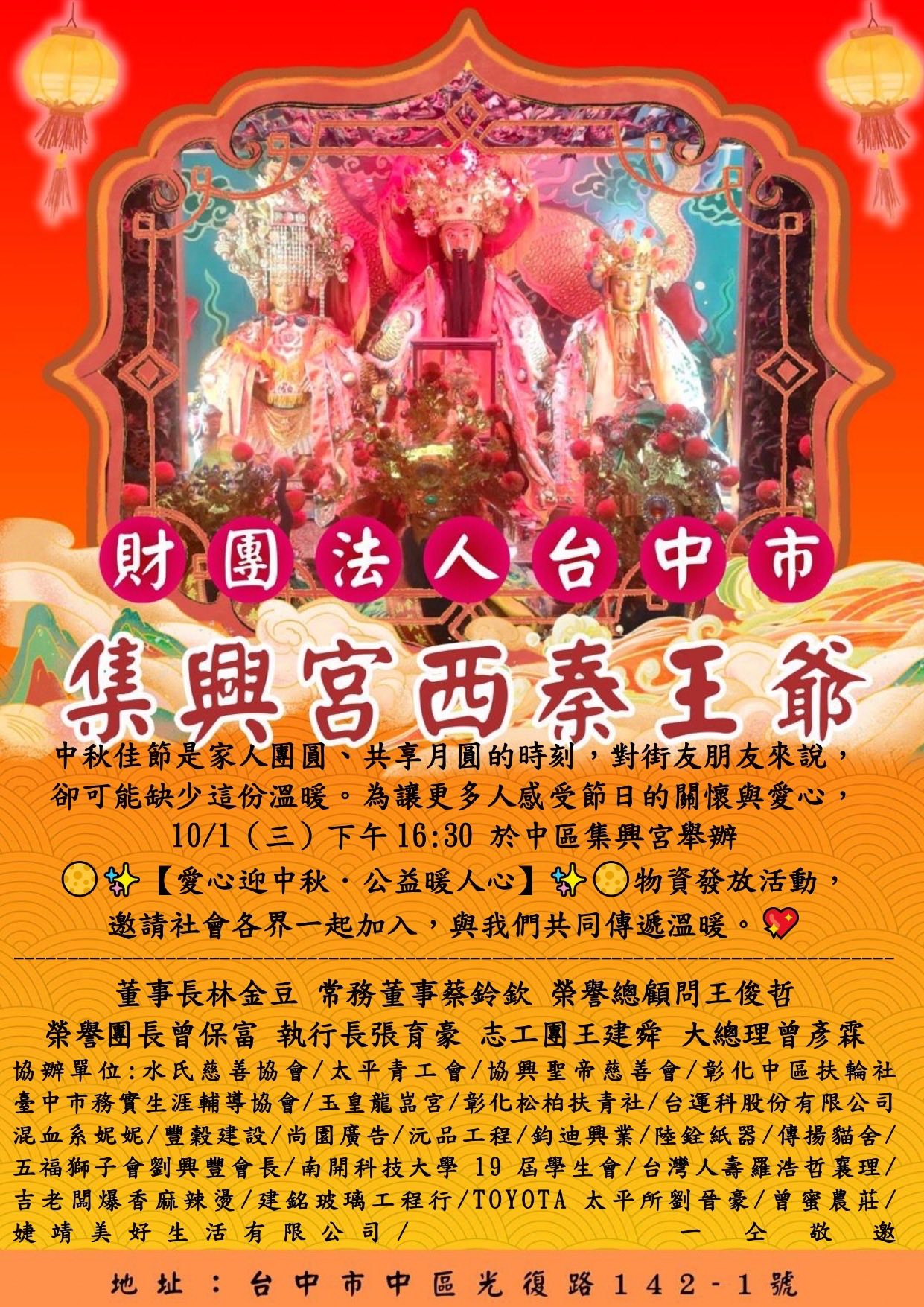 中秋佳節象徵著闔家團圓的溫暖與歡樂,然而,仍有許多街友和弱勢朋友無法共享這份幸福。在這個特別的節日裡,集興宮西秦王爺攜手水氏慈善協會、太平青工會及藍興堡協會,透過公益行動,將愛與關懷傳遞到需要的人心中。