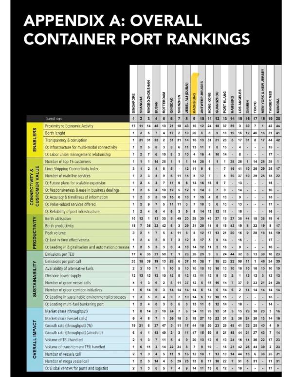 挪威船級社(DNV)最新2025年全球貨櫃港口排名,高雄港名列全球第9名。